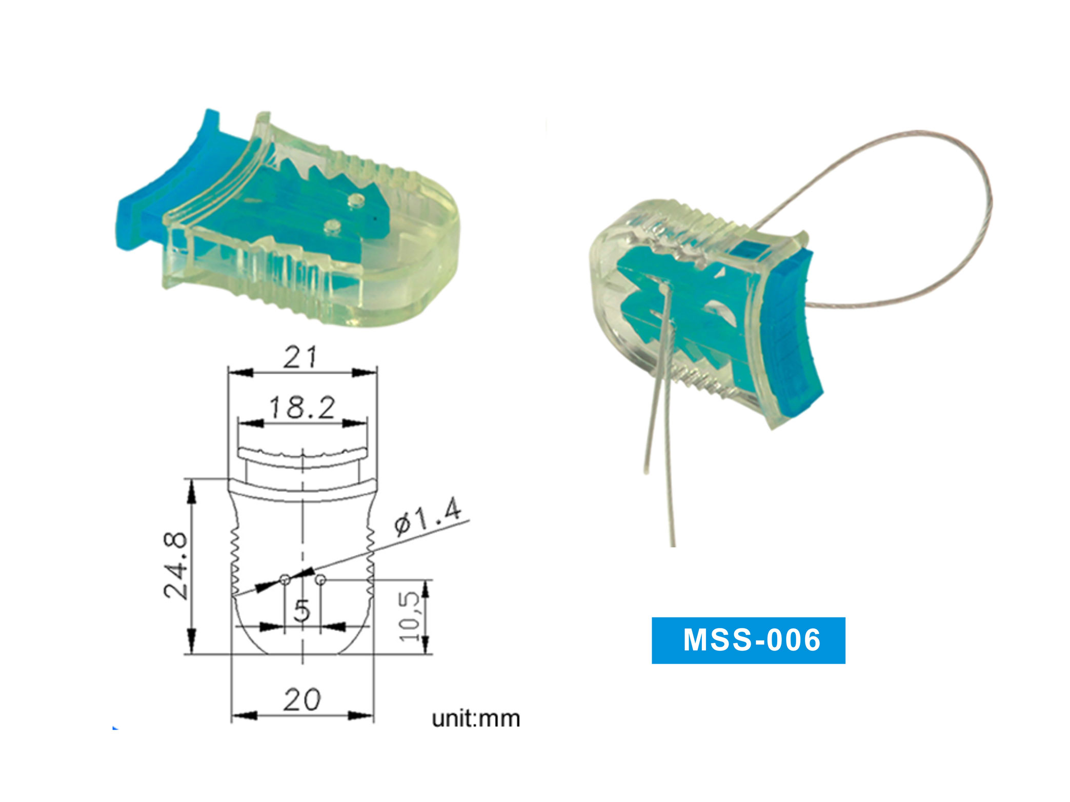 Este modelo es totalmente de plástico y el alambre de cierre forma parte del precinto. La parte externa es transparente para poder controlar el sistema de cierre. La parte externa es transparente para poder controlar el sistema de cierre. El cierre se efectua girando la lengueta en sentido horario. Cuando se llega al punto deseado, se aconseja romper la lengueta doblandola por una parte.