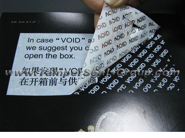 This type of tamper proof labels will leave little adhesive if peeled away, the word “VOID” appearing on the label may indicate unauthorized access.